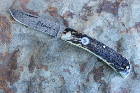 With roots in Texas and Solingen, Germany, we are proud of the return of El Gallo knives. This is the El Gallo EG99jrDSdam with Round Shield. Blade is 2.75", length open is 6 7/8", and length closed is 3 7/8". Handle thickness is up to 3/4" but will vary some because it is a natural product. D2 Damascus blade with Stag handles.