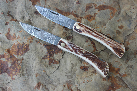 With roots in Texas and Solingen, Germany, we are proud of the return of El Gallo knives. This is the El Gallo 99jrDSLdam. Blade is 2.75", length open is 6 1/2", and length closed is 3 1/2". Handle thickness is up to 3/4" but will vary some because it is a natural product. D2 Damascus blade with Stag handles.